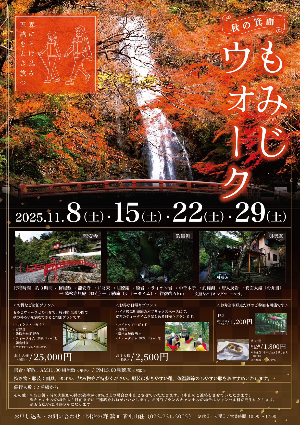 イベント情報・お知らせNews Release トップ > イベント情報・お知らせ > 明徳庵 「もみじウォーク」イベント 2025年09月29日 明徳庵 「もみじウォーク」イベント 11月8日・15日・22日・29日開催 行程時間:約3時間 お得なご宿泊・日帰りプランがございます。是非ご参加ください。 « 出前和食注文変更のお知らせ 店舗統合のご案内と配達に関する重要な... »